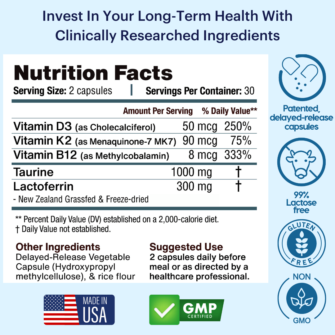 - DNA Protection: Lactoferrin serves as a guardian for your DNA, preventing cellular damage and supporting overall health, and reducing the speed of aging.